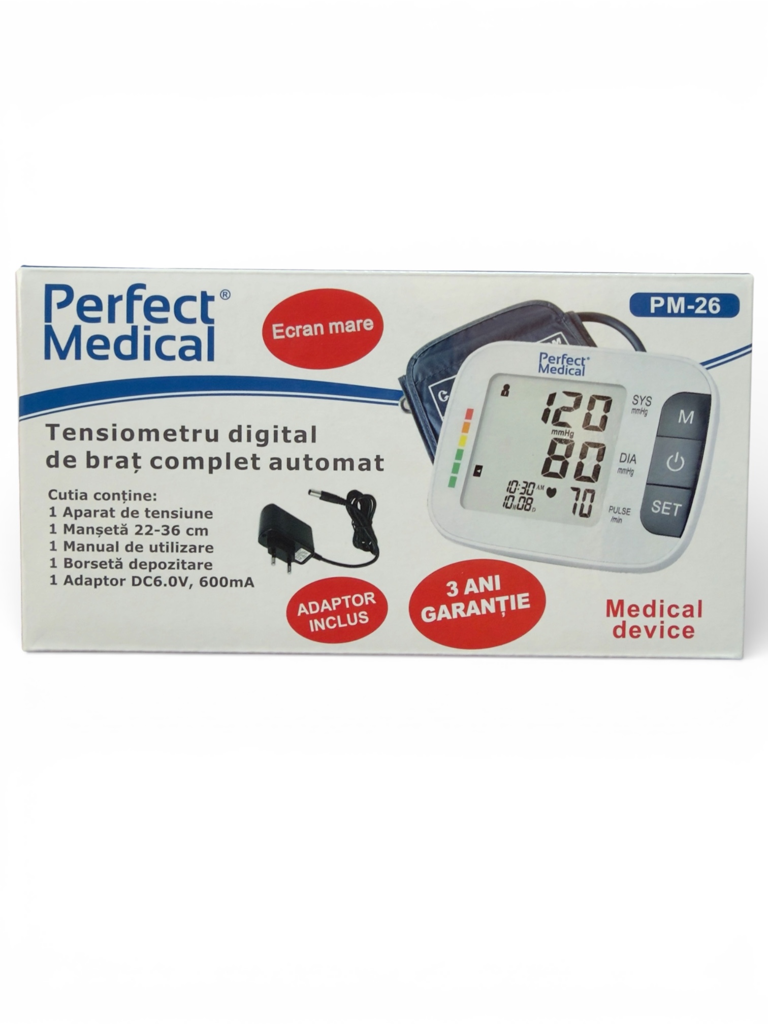 Monitorizează-ți tensiunea arterială cu Tensiometrul de Braț Perfect Medical®, un dispozitiv profesional avizat medical, proiectat pentru a oferi măsurători precise și fiabile. Acest tensiometru modern este echipat cu un ecran iluminat, facilitând citirea rezultatelor chiar și în condiții de iluminare scăzută.
